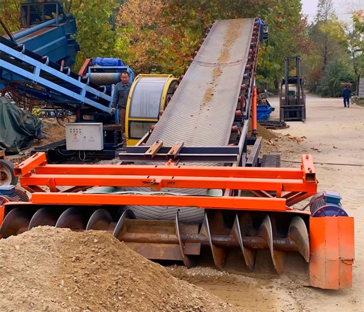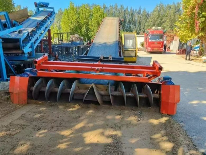 礦渣水泥廢料由地坑或料倉經(jīng)給料機(jī)進(jìn)行下料,進(jìn)入皮帶輸送機(jī)系統(tǒng)。皮帶機(jī)采用耐磨橡膠帶,輸送機(jī)傾角≤18°,末端設(shè)置可調(diào)高度的裝車溜槽,直接對接卡車車廂。全線可以配置防塵罩、導(dǎo)料裙板及噴霧除塵系統(tǒng),減少揚(yáng)塵污染。該方案連續(xù)性好,維護(hù)成本低,適合場地較為開闊、水平輸送距離較長的工況。